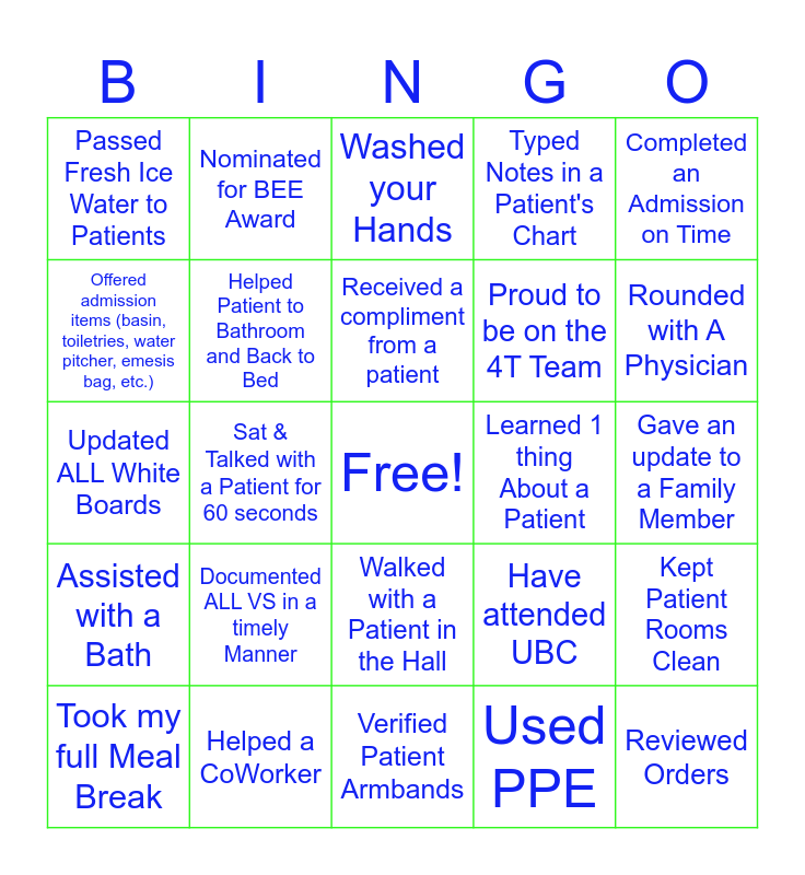 This bingo card has a free space and 34 words: Attended Safety Huddle, Used PPE, Passed a Meal Tray, Gave A Shout out, Assisted with a Bath, Helped Patient to Bathroom and Back to Bed, Completed an Admission on Time, Took my full Meal Break, Nominated for BEE Award, Did Bedside Shift Report, Received a compliment from a patient, Washed your Hands, Discharged 3 people, Nominated for Daisy Award, Learned 1 thing About a Patient, Rounded with A Physician, Helped a CoWorker, Updated ALL White Boards, Documented ALL VS in a timely Manner, Have attended UBC, Walked with a Patient in the Hall, Verified a Bed Alarm was active, Passed Fresh Ice Water to Patients, Gave an update to a Family Member, Verified Patient Armbands, Reviewed Orders, Typed Notes in a Patient's Chart, Completed Charting by Noon, Proud to be on the 4T Team, Offered admission items (basin, toiletries, water pitcher, emesis bag, etc.), Helped PT/OT, Sat & Talked with a Patient for 60 seconds, Kept Patient Rooms Clean and Kept Area Tidy & Organized.