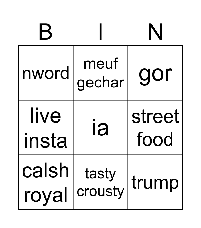 This bingo card has a free space and 8 words: street food, gor, meuf gechar, calsh royal, nword, trump, live insta and tasty crousty.