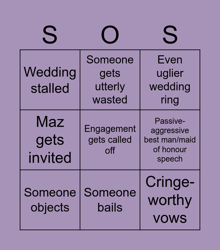 This bingo card has a free space and 12 words: No Divorce, Tacky wedding, Cringe-worthy vows, Passive-aggressive best man/maid of honour speech, Someone gets utterly wasted, Even uglier wedding ring, Someone bails, Early Divorce, Wedding stalled, Maz gets invited, Someone objects and Awful dress.
