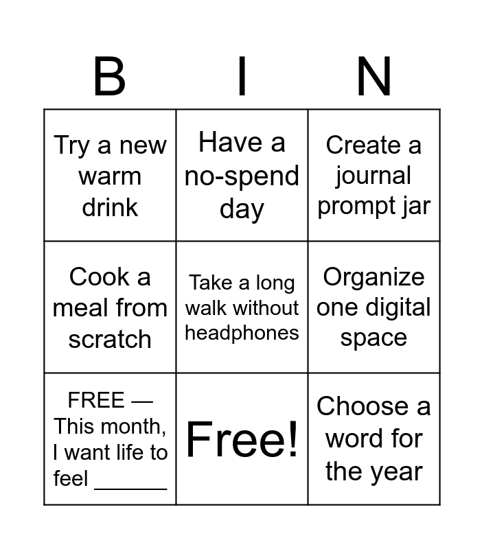 This bingo card has 10 words: Free!, Create a journal prompt jar, Try a new warm drink, Take a long walk without headphones, Cook a meal from scratch, FREE — This month, I want life to feel ______, Have a no-spend day, Write a letter to your future self, Organize one digital space and Choose a word for the year.