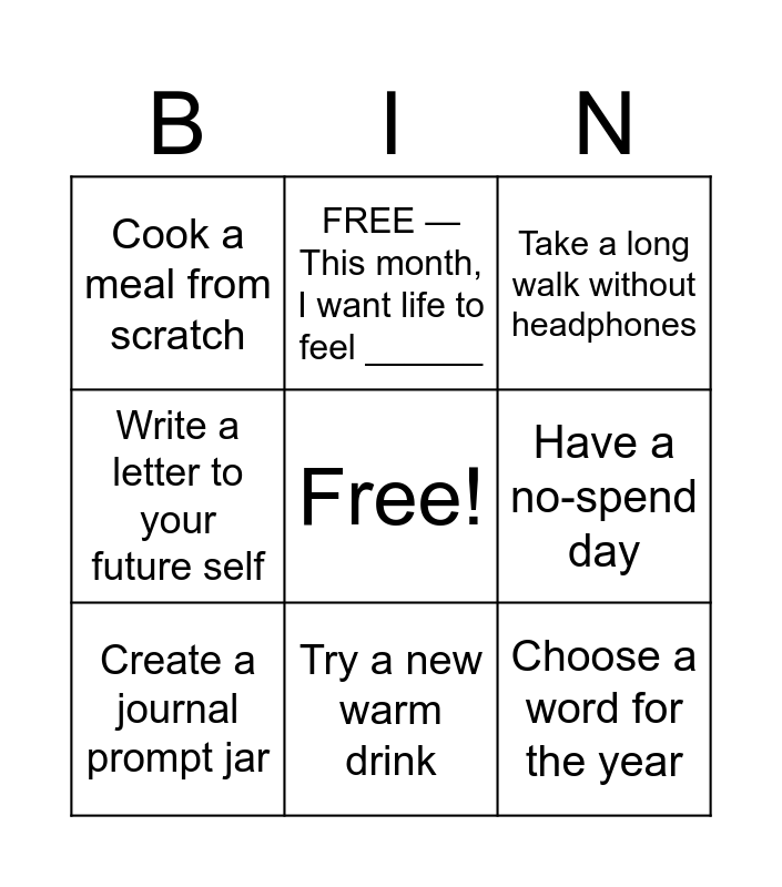 This bingo card has a free space and 9 words: Create a journal prompt jar, Try a new warm drink, Take a long walk without headphones, Cook a meal from scratch, FREE — This month, I want life to feel ______, Have a no-spend day, Write a letter to your future self, Organize one digital space and Choose a word for the year.