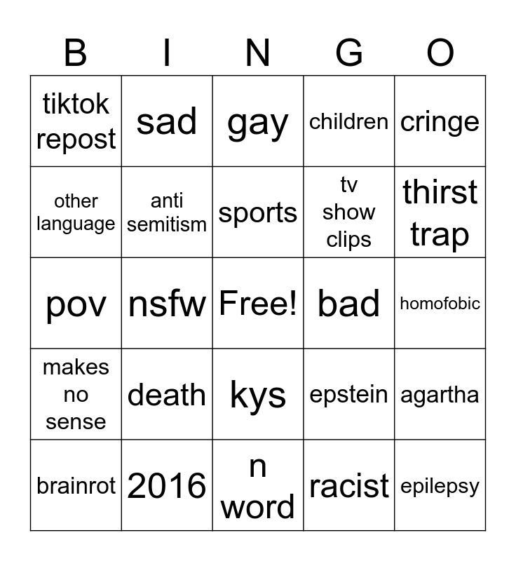 This bingo card has a free space and 24 words: death, 2016, sports, brainrot, cringe, tiktok repost, other language, sad, bad, kys, tv show clips, pov, epstein, agartha, anti semitism, racist, homofobic, gay, thirst trap, nsfw, epilepsy, makes no sense, children and n word.