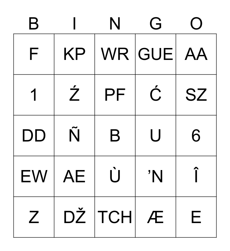 This bingo card has 190 words: Q, W, E, Ė, Ę, Ē, Ê, È, É, Ë, R, T, Y, Ÿ, U, Ū, Ù, Û, Ü, Ú, I, Ì, Į, Í, Î, Ï, Ī, O, Õ, Ø, Ō, Œ, Ò, Ô, Ö, Ó, P, A, Ã, Å, Ā, À, Á, Â, Ä, Æ, S, Ś, Š, D, F, G, H, J, K, L, Ł, Z, Ż, Ž, Ź, X, C, Č, Ç, Ć, V, B, N, Ñ, Ń, M, AE, OE, CH, UO, AA, EE, II, OO, UU, IJ, KW, GW, KH, ZS, DZS, SZ, SS, TH, DD, DH, RR, LL, GU, QU, XH, NG, TŠ, DŽ, KA, ’, ’N, AU, OU, PF, VV, RH, SCH, TSCH, MN, WR, WH, GJ, LY, NJ, TY, EW, EÖ, CZ, TS, DZ, CS, GB, SH, LJ, ER, AR, OR, UR, IR, DL, UM, CC, CK, OORE, IGH, GÜ, GUE, GUI, TL, OY, PH, AW, NK, ARE, IRE, ORE, OOR, URE, KP, TT, DG, DGE, QUE, TCH, ’K, ÖÖ, ÅÅ, OÓ, DX, KN, GN, CQU, EAU, EAUX, CQUES, CQUE, AO, AI, OI, NGC, THSH, CN, YA’, EI, 1, 2, 3, 4, 5, 6, 7, 8, 9, 0, @, %, ; and !.