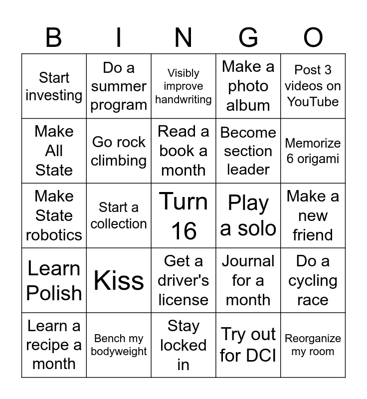 This bingo card has a free space and 24 words: Kiss, Bench my bodyweight, Read a book a month, Learn a recipe a month, Post 3 videos on YouTube, Start investing, Make All State, Do a summer program, Play a solo, Get a driver's license, Become section leader, Make State robotics, Journal for a month, Do a cycling race, Go rock climbing, Try out for DCI, Make a new friend, Visibly improve handwriting, Memorize 6 origami, Start a collection, Reorganize my room, Learn Polish, Make a photo album and Stay locked in.