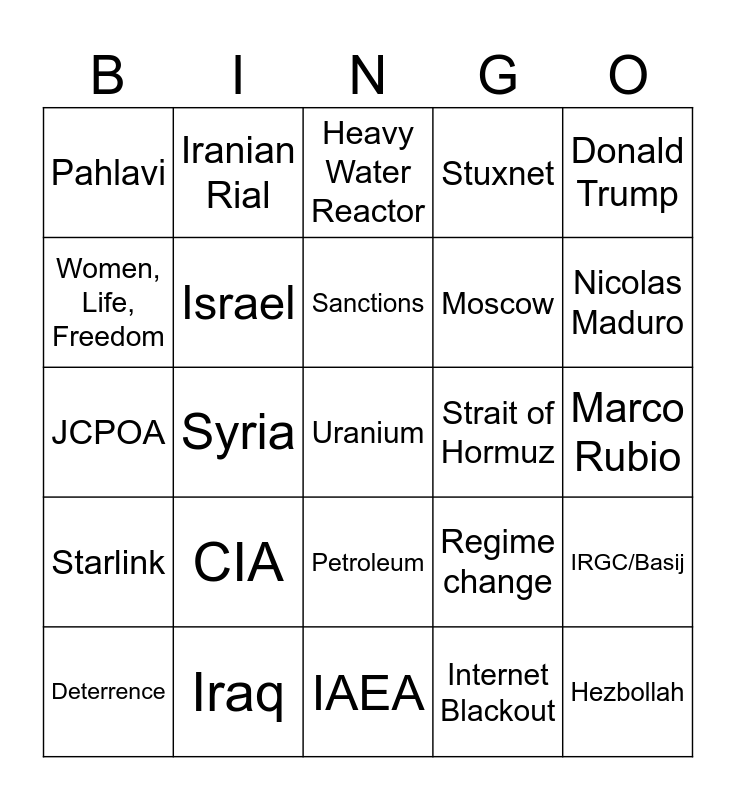 This bingo card has a free space and 24 words: CIA, Iraq, Sanctions, Deterrence, Donald Trump, Pahlavi, Women, Life, Freedom, Iranian Rial, Strait of Hormuz, Petroleum, Moscow, JCPOA, Regime change, IRGC/Basij, Israel, Internet Blackout, Marco Rubio, Heavy Water Reactor, Nicolas Maduro, Syria, Hezbollah, Starlink, Stuxnet and IAEA.