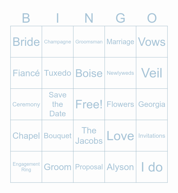 This bingo card has a free space and 34 words: Wedding Dress, Alyson, Reception, Black and Blue, Chapel, Tuxedo, Vows, Engagement Ring, Champagne, Paris, Boise, Groomsman, Tony, Bridesmaid, Flowers, Veil, Groom, Ceremony, Bouquet, Love, The Jacobs, Honeymoon, Bride, Georgia, Proposal, I do, Marriage, Family, Newlyweds, Fiancé, Cake, Save the Date, Invitations and Dance Floor.