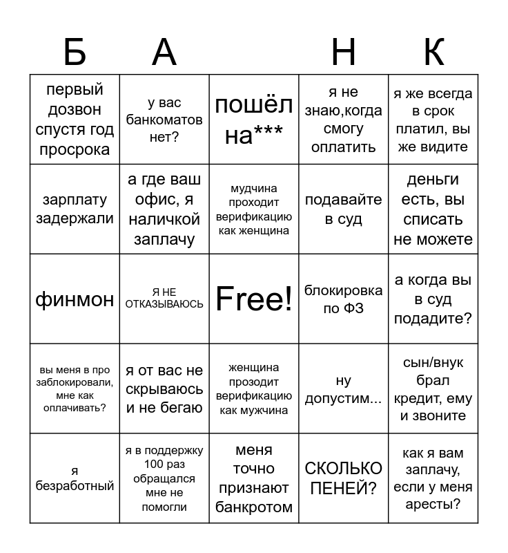 This bingo card has a free space and 24 words: я от вас не скрываюсь и не бегаю, я в поддержку 100 раз обращался мне не помогли, мудчина проходит верификацию как женщина, я безработный, я же всегда в срок платил, вы же видите, первый дозвон спустя год просрока, зарплату задержали, у вас банкоматов нет?, блокировка по ФЗ, женщина прозодит верификацию как мужчина, подавайте в суд, финмон, ну допустим..., сын/внук брал кредит, ему и звоните, а где ваш офис, я наличкой заплачу, СКОЛЬКО ПЕНЕЙ?, а когда вы в суд подадите?, пошёл на***, деньги есть, вы списать не можете, Я НЕ ОТКАЗЫВАЮСЬ, как я вам заплачу, если у меня аресты?, вы меня в про заблокировали, мне как оплачивать?, я не знаю,когда смогу оплатить and меня точно признают банкротом.