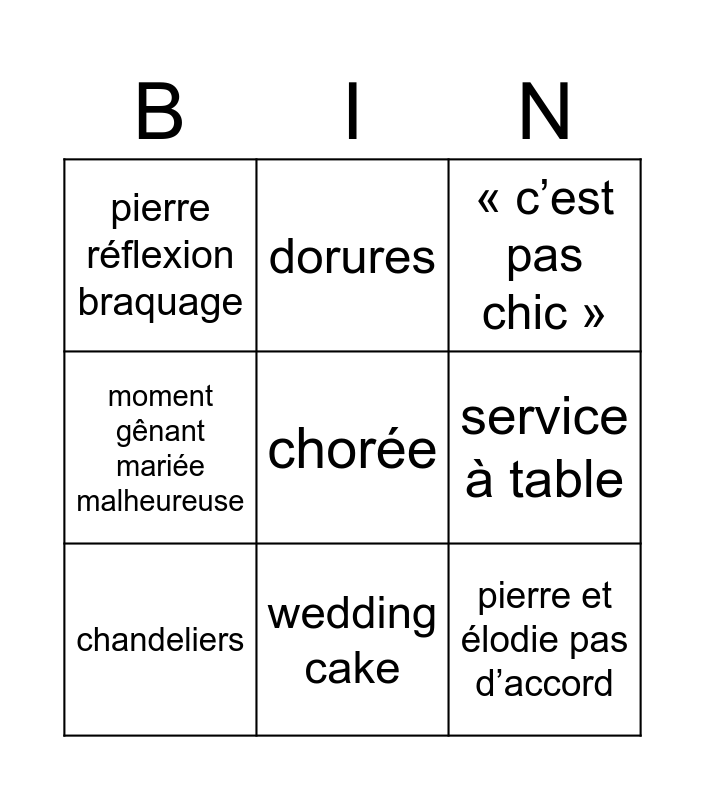 This bingo card has a free space and 8 words: service à table, « c’est pas chic », dorures, chandeliers, pierre réflexion braquage, pierre et élodie pas d’accord, moment gênant mariée malheureuse and wedding cake.
