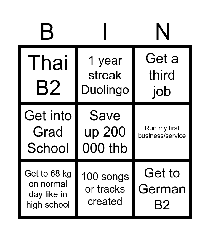 This bingo card has 10 words: Get to 68 kg on normal day like in high school, 1 year streak Duolingo, Get a third job, Get into Grad School, Save up 200 000 thb, Get to German B2, Thai B2, 100 songs or tracks created, Run my first business/service and I.