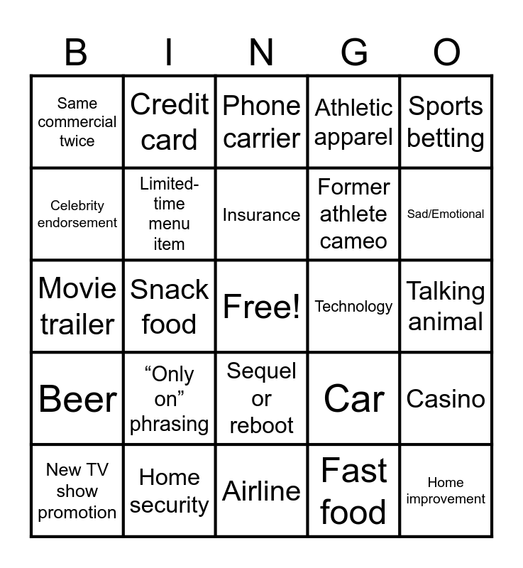 This bingo card has a free space and 32 words: Fast food, Pizza, Snack food, Soda or energy drink, Beer, Limited-time menu item, Sports betting, Casino, Credit card, Banking or finance, Insurance, Phone carrier, App, AI, Technology, Streaming service, New TV show promotion, Movie trailer, Sequel or reboot, “Only on” phrasing, Car, Chicago Bear appearance, Talking animal, Home security, Home improvement, Athletic apparel, Former athlete cameo, Celebrity endorsement, Same commercial twice, Airline, Spanish and Sad/Emotional.