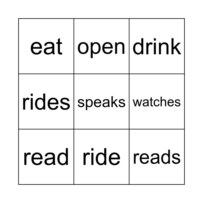 This bingo card has a free space and 17 words: plays, live, drink, eat, watch, rides, opens, read, ride, watches, speak, eats, reads, open, drinks, play and lives.