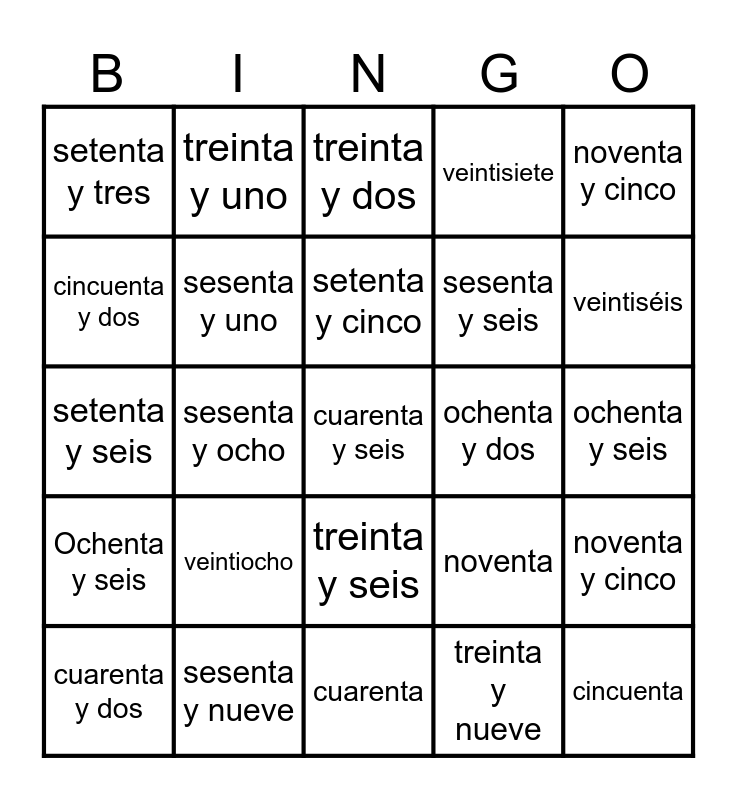 This bingo card has 101 words: setenta y uno, noventa y nueve, noventa y cinco, cuatro, cinco, sesenta y tres, setenta, ocho, diez, treinta y ocho, doce, ochenta y cinco, noventa y cuatro, catorce, veinticuatro, dieciséis, Ochenta y seis, treinta y cuatro, diecinueve, Noventa y uno, veintiuno, cuarenta y nueve, veintitres, cincuenta y uno, veinticinco, veintiséis, veintisiete, veintiocho, veintinueve, treinta, treinta y uno, treinta y dos, treinta y tres, treinta y cuatro, treinta y cinco, treinta y seis, treinta y siete, treinta y ocho, treinta y nueve, cuarenta, cuarenta y uno, cuarenta y dos, cuarenta y tres, cuarenta y cuatro, cuarenta y cinco, cuarenta y seis, cuarenta y siete, cuarenta y ocho, cuarenta y nueve, cincuenta, cincuenta y uno, cincuenta y dos, cincuenta y tres, cincuenta y cuatro, cincuenta y cinco, cincuenta y seis, cincuenta y siete, cincuenta y ocho, cincuenta y nueve, sesenta, sesenta y uno, sesenta y dos, sesenta y tres, sesenta y cuatro, sesenta y cinco, sesenta y seis, sesenta y siete, sesenta y ocho, sesenta y nueve, setenta, setenta y uno, setenta y dos, setenta y tres, setenta y cuatro, setenta y cinco, setenta y seis, setenta y siete, setenta y ocho, setenta y nueve, setenta y diez, ochenta, ochenta y uno, ochenta y dos, ochenta y tres, ochenta y cuatro, ochenta y cinco, ochenta y seis, ochenta y siete, ochenta y ocho, ochenta y nueve, noventa, noventa y uno, noventa y dos, noventa y tres, noventa y cuatro, noventa y cinco, noventa y seis, noventa y siete, noventa y ocho, noventa y nueve and cien.