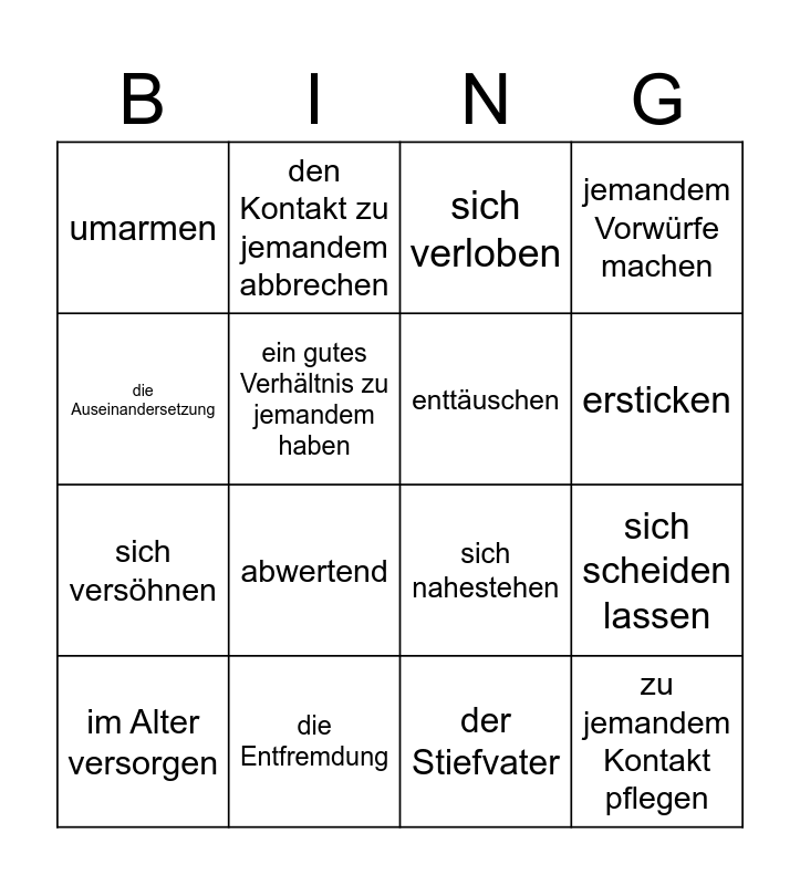 This bingo card has 16 words: die Entfremdung, sich scheiden lassen, sich verloben, umarmen, sich versöhnen, den Kontakt zu jemandem abbrechen, sich nahestehen, der Stiefvater, die Auseinandersetzung, ein gutes Verhältnis zu jemandem haben, im Alter versorgen, jemandem Vorwürfe machen, abwertend, ersticken, enttäuschen and zu jemandem Kontakt pflegen.