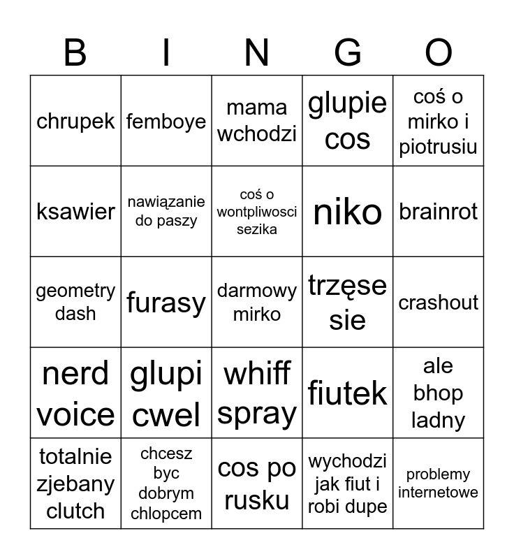 This bingo card has a free space and 24 words: glupi cwel, chcesz byc dobrym chlopcem, coś o wontpliwosci sezika, totalnie zjebany clutch, coś o mirko i piotrusiu, chrupek, ksawier, femboye, trzęse sie, whiff spray, niko, geometry dash, fiutek, ale bhop ladny, nawiązanie do paszy, wychodzi jak fiut i robi dupe, crashout, mama wchodzi, brainrot, furasy, problemy internetowe, nerd voice, glupie cos and cos po rusku.