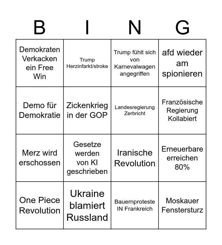 This bingo card has 16 words: Ukraine blamiert Russland, Erneuerbare erreichen 80%, Trump fühlt sich von Karnevalwagen angegriffen, Demokraten Verkacken ein Free Win, Merz wird erschossen, Trump Herzinfarkt/stroke, Iranische Revolution, Bauernproteste IN Frankreich, Demo für Demokratie, Zickenkrieg in der GOP, One Piece Revolution, afd wieder am spionieren, Gesetze werden von KI geschrieben, Französische Regierung Kollabiert, Landesregierung Zerbricht and Moskauer Fenstersturz.