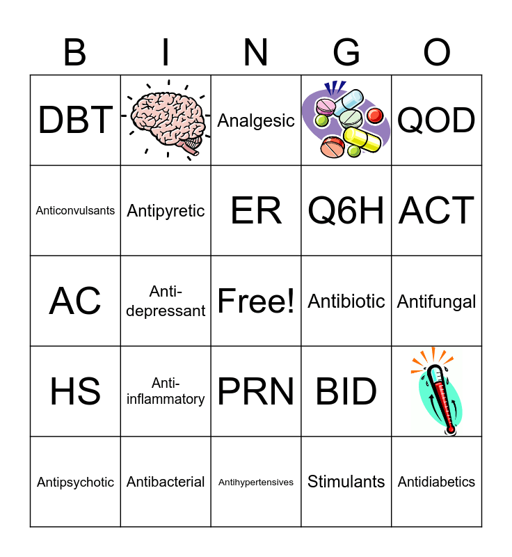 This bingo card has 3 images, a free space and 26 words: Antipsychotic, Mood Stabilizer, Anti-depressant, CBT, DBT, Analgesic, Antipyretic, Anti-inflammatory, Antibiotic, Antibacterial, Antifungal, Antidiabetics, Antihypertensives, Stimulants, ACT, OTC, PRN, HS, QOD, AC, BID, TID, Q6H, Anticonvulsants, ER and ODT.