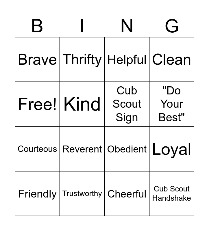 This bingo card has 16 words: Trustworthy, Loyal, Helpful, Brave, Courteous, Thrifty, Obedient, Cheerful, Free!, Kind, Friendly, Clean, Reverent, "Do Your Best", Cub Scout Sign and Cub Scout Handshake.