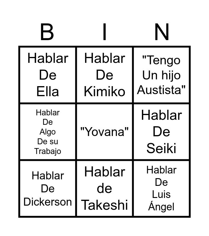 This bingo card has a free space and 8 words: Hablar De Seiki, "Tengo Un hijo Austista", Hablar De Kimiko, Hablar De Dickerson, Hablar De Ella, Hablar De Luis Ángel, Hablar De Algo De su Trabajo and Hablar de Takeshi.