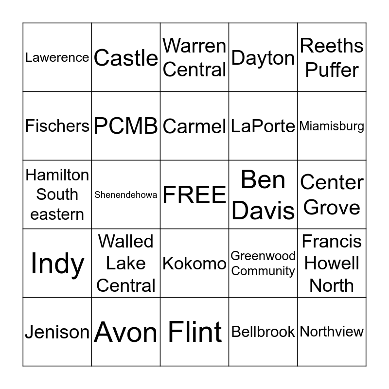 This bingo card has a free space and 24 words: Walled Lake Central, Avon, Carmel, Jenison, Reeths Puffer, Lawerence, Fischers, Castle, Ben Davis, Kokomo, LaPorte, Hamilton South eastern, Greenwood Community, Francis Howell North, PCMB, Bellbrook, Center Grove, Warren Central, Miamisburg, Shenendehowa, Northview, Indy, Dayton and Flint.