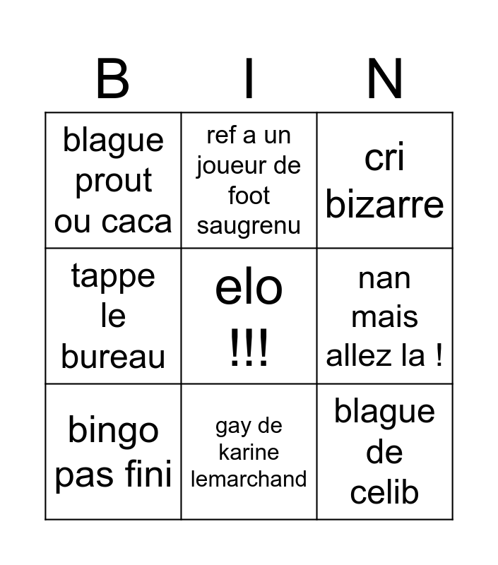 This bingo card has a free space and 8 words: nan mais allez la !, cri bizarre, ref a un joueur de foot saugrenu, bingo pas fini, blague prout ou caca, blague de celib, tappe le bureau and gay de karine lemarchand.