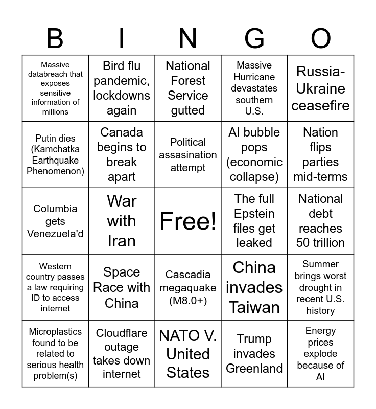 This bingo card has a free space and 24 words: Space Race with China, Cloudflare outage takes down internet, Political assasination attempt, Microplastics found to be related to serious health problem(s), Russia-Ukraine ceasefire, Massive databreach that exposes sensitive information of millions, Putin dies (Kamchatka Earthquake Phenomenon), Bird flu pandemic, lockdowns again, The full Epstein files get leaked, Cascadia megaquake (M8.0+), AI bubble pops (economic collapse), Columbia gets Venezuela'd, China invades Taiwan, Summer brings worst drought in recent U.S. history, Canada begins to break apart, Trump invades Greenland, National debt reaches 50 trillion, National Forest Service gutted, Nation flips parties mid-terms, War with Iran, Energy prices explode because of AI, Western country passes a law requiring ID to access internet, Massive Hurricane devastates southern U.S. and NATO V. United States.