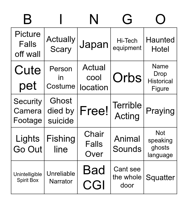This bingo card has a free space and 49 words: Air currents, Squatter, Just their friend, Bad CGI, Fishing line, Sweep Cut, Actually Scary, Using their child, Cute pet, Inanimate Object that looks humanoid, Person in Costume, Hi-Tech equipment, Not speaking ghosts language, Animal Sounds, Perfect Camera Angle, Nightvision Camera, Actual cool location, Terrible Acting, Item thrown from off screen, Haunted Hotel, Ghost died by suicide, Cant see the whole door, Picture Falls off wall, Orbs, Red Circle, Name Drop Historical Figure, Unintelligible Spirit Box, 3:00 am, Chair Falls Over, Lights Go Out, Dash Cam Footage, Performing a Ritual, Lights in the Sky, Sped Up Footage, Unreliable Narrator, Why was this being filmed?, Abandoned Hospital, Red Arrow, Praying, Literally Nothing, Murder Victim Ghost, "They Were Home Alone", Effective Jump Scare, Burning Sage, Security Camera Footage, Japan, Person grabbed by invisible force, Creepy Doll and Reflection.