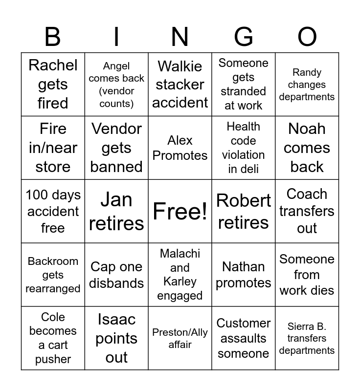 This bingo card has a free space and 24 words: Cap one disbands, Isaac points out, Alex Promotes, Cole becomes a cart pusher, Randy changes departments, Rachel gets fired, Fire in/near store, Angel comes back (vendor counts), Robert retires, Malachi and Karley engaged, Health code violation in deli, 100 days accident free, Nathan promotes, Someone from work dies, Vendor gets banned, Customer assaults someone, Coach transfers out, Walkie stacker accident, Noah comes back, Jan retires, Sierra B. transfers departments, Backroom gets rearranged, Someone gets stranded at work and Preston/Ally affair.