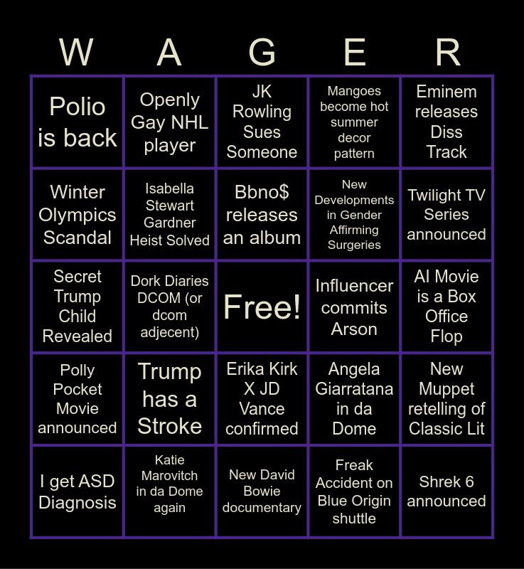This bingo card has a free space and 24 words: Trump has a Stroke, Katie Marovitch in da Dome again, Bbno$ releases an album, I get ASD Diagnosis, Eminem releases Diss Track, Polio is back, Winter Olympics Scandal, Openly Gay NHL player, Influencer commits Arson, Erika Kirk X JD Vance confirmed, New Developments in Gender Affirming Surgeries, Secret Trump Child Revealed, Angela Giarratana in da Dome, New Muppet retelling of Classic Lit, Isabella Stewart Gardner Heist Solved, Freak Accident on Blue Origin shuttle, AI Movie is a Box Office Flop, JK Rowling Sues Someone, Twilight TV Series announced, Dork Diaries DCOM (or dcom adjecent), Shrek 6 announced, Polly Pocket Movie announced, Mangoes become hot summer decor pattern and New David Bowie documentary.