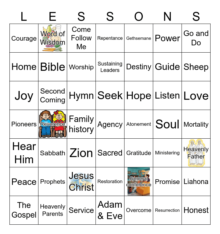 This bingo card has 15 images and 123 words: First Vision, Prayer, Heavenly Father, Church, Sacrament, Scriptures, Word of Wisdom, Baptism, Reverence, General conference, Joseph Smith, Faith, Jesus Christ, Children, Music, Resurrection, Love, Family, Family prayer, Priesthood, Family history, Home, Missionary work, Marriage, Trust, Repentance, Pioneers, Prophets, Temple, Book of Mormon, Atonement, Sustaining Leaders, Second Coming, Tithing, Service, Holy Ghost, Commandments, Covenants, The Gospel, Charity, Hope, Forgiveness, Adam & Eve, The Plan of Salvation, Gratitude, President Oaks, Sabbath, Liahona, CTR, Hymn, Eternity, Ministering, Revelation, Angel, Creation, Fasting, The Family Proclamation, Gathering Israel, The Fall, Mortality, Obedience, Strength, Disciple, Remember, Light, Sheep, Gift, Peace, Joy, Restoration, Hear Him, Earth, Come Follow Me, Healing, Sacrifice, Heart, Blessing, Gethsemane, Heavenly Parents, Holy, Soul, Sacred, Listen, Power, Heaven, Teach, Bible, Comfort, Truth, Grace, Savior, Salvation, Go and Do, Guide, Child of God, Kind, Worth, Mercy, Sealing, Redeemer, Seek, Celestial Kingdom, Courage, Together, Compassion, Honest, Destiny, Miracles, Growth, The Church of Jesus Christ of Latter-Day Saints, Happy, Zion, Overcome, Feel, Believe, Promise, Smile, Agency, Endure, Justice, Ordinance, Worship and Patriarchal Blessing.