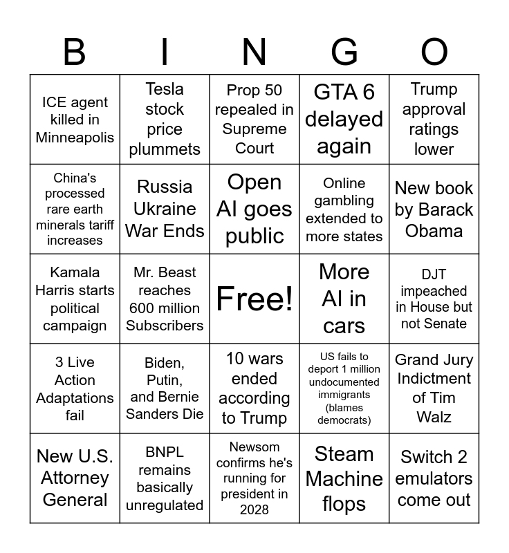 This bingo card has a free space and 24 words: Biden, Putin, and Bernie Sanders Die, BNPL remains basically unregulated, Open AI goes public, New U.S. Attorney General, Trump approval ratings lower, ICE agent killed in Minneapolis, China's processed rare earth minerals tariff increases, Tesla stock price plummets, More AI in cars, 10 wars ended according to Trump, Online gambling extended to more states, Kamala Harris starts political campaign, US fails to deport 1 million undocumented immigrants (blames democrats), Grand Jury Indictment of Tim Walz, Russia Ukraine War Ends, Steam Machine flops, DJT impeached in House but not Senate, Prop 50 repealed in Supreme Court, New book by Barack Obama, Mr. Beast reaches 600 million Subscribers, Switch 2 emulators come out, 3 Live Action Adaptations fail, GTA 6 delayed again and Newsom confirms he's running for president in 2028.