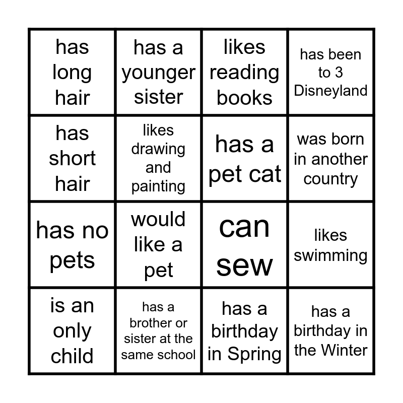 This bingo card has 20 words: likes swimming, has a older brother, likes reading books, has a pet dog, is an only child, has short hair, has a brother or sister at the same school, has long hair, has no pets, has a younger sister, would like a pet, can sew, likes drawing and painting, has a birthday in the Winter, has a pet cat, likes Kpop, was born in another country, has been to 3 Disneyland, has a birthday in Spring and plays a sport.