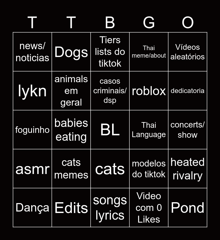 This bingo card has a free space and 44 words: PondPhuwin, Pond, Me and Thee, Dança, Tuga, Video com 0 Likes, Tiers lists do tiktok, Memes, Vídeos aleatórios, Edits, Thai meme/about, Thai Language, cats, cats memes, wierd memes, songs lyrics, slides, foguinho, vídeo de casal, dedicatoria, Dogs, séries /animes /filmes, random edits, news/ noticias, random trend slides, concerts/ show, sad edits, novelas random, modelos do tiktok, asmr, politica, heated rivalry, 2016/17/ 18/19 vibes, tension on bl couples, babies eating, draws, old guys, wierd cat memes, casos criminais/ dsp, lykn, roblox, youtubers, animals em geral and things to send.