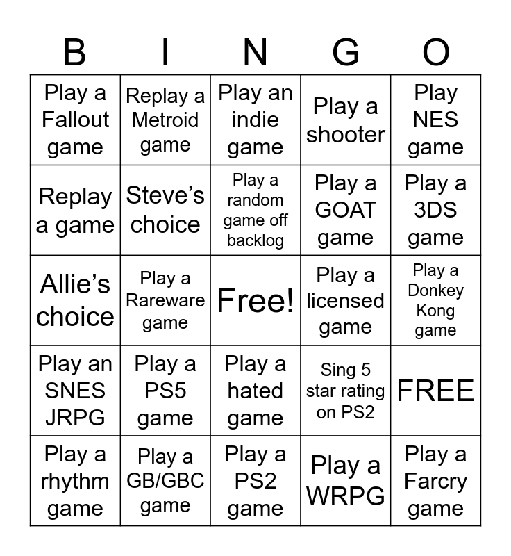 This bingo card has a free space and 25 words: Play a PS5 game, Play a PS2 game, Play a random game off backlog, Play a rhythm game, Play NES game, Play a Fallout game, Replay a game, Replay a Metroid game, Play a licensed game, Play a hated game, Play a GOAT game, Allie’s choice, Sing 5 star rating on PS2, FREE, Steve’s choice, Play a Darksouls game, Play a Donkey Kong game, Play an indie game, Play a 3DS game, Play a Rareware game, Play a Farcry game, Play a GB/GBC game, Play an SNES JRPG, Play a shooter and Play a WRPG.