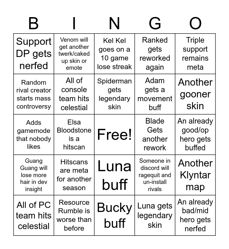 This bingo card has a free space and 24 words: Hitscans are meta for another season, Resource Rumble is worse than before, Spiderman gets legendary skin, All of PC team hits celestial, Triple support remains meta, Support DP gets nerfed, Random rival creator starts mass controversy, Venom will get another twerk/caked up skin or emote, Blade Gets another rework, Luna buff, Adam gets a movement buff, Adds gamemode that nobody likes, Someone in discord will ragequit and un-install rivals, Another Klyntar map, All of console team hits celestial, Luna gets legendary skin, An already good/op hero gets buffed, Kel Kel goes on a 10 game lose streak, Another gooner skin, Elsa Bloodstone is a hitscan, An already bad/mid hero gets nerfed, Guang Guang will lose more hair in dev insight, Ranked gets reworked again and Bucky buff.
