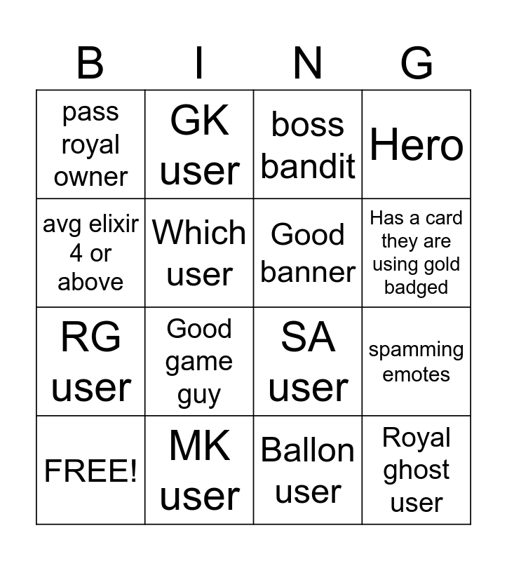 This bingo card has 16 words: MK user, spamming emotes, boss bandit, pass royal owner, RG user, GK user, SA user, Ballon user, avg elixir 4 or above, Which user, FREE!, Hero, Good game guy, Has a card they are using gold badged, Good banner and Royal ghost user.