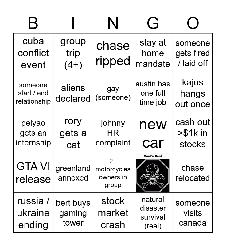 This bingo card has 1 images and 24 words: greenland annexed, stock market crash, gay (someone), russia / ukraine ending, someone gets fired / laid off, cuba conflict event, someone start / end relationship, group trip (4+), new car, 2+ motorcycles owners in group, austin has one full time job, peiyao gets an internship, chase relocated, aliens declared, someone visits canada, cash out >$1k in stocks, chase ripped, kajus hangs out once, rory gets a cat, johnny HR complaint, bert buys gaming tower, GTA VI release, stay at home mandate and natural disaster survival (real).