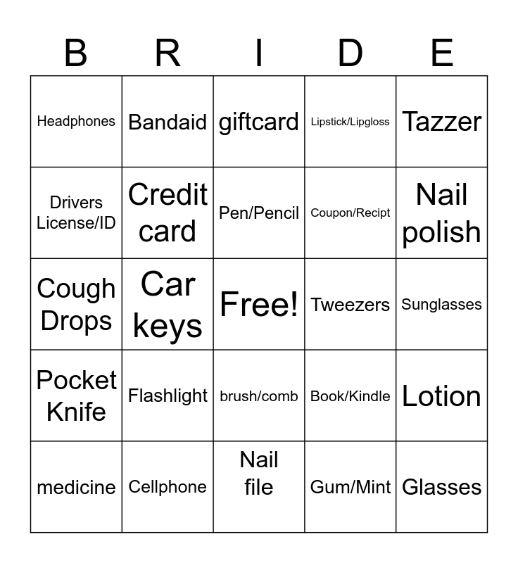 This bingo card has a free space and 30 words: Cellphone, Tampon/pad, Car keys, Deoderant, Headphones, giftcard, Credit card, brush/comb, Tweezers, Nail file, Sunglasses, Glasses, Gum/Mint, Snacks, Nail polish, Perfume/Soby Spray, Book/Kindle, Pocket Knife, Flashlight, Tazzer, Cough Drops, Sew Kit, Bandaid, Coupon/Recipt, Drivers License/ID, Lipstick/Lipgloss, Lotion, medicine, Pen/Pencil and Underwear.