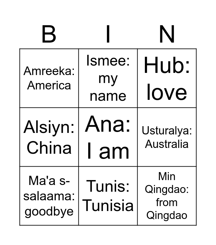 This bingo card has 13 words: Free!, Ahalan: hello, Ma'a s-salaama: goodbye, Ismee: my name, Alsiyn: China, Ana: I am, Min Qingdao: from Qingdao, Shukran: Thank you, Tunis: Tunisia, Amreeka: America, Usturalya: Australia, Hub: love and uhibu: I love.