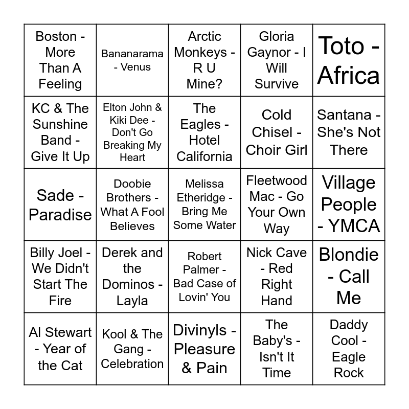 This bingo card has 46 words: Cold Chisel - Bow River, Melissa Etheridge - Bring Me Some Water, Goanna - Solid Rock, Divinyls - Pleasure & Pain, Derek and the Dominos - Layla, The Knack - My Sharona, Bananarama - Venus, Kim Wilde - You Keep Me Hangin' On, KC & The Sunshine Band - Give It Up, Bee Gees - Jive Talkin, Elton John & Kiki Dee - Don't Go Breaking My Heart, Gloria Gaynor - I Will Survive, Blondie - Call Me, Nick Cave - Red Right Hand, Nick Cave - Where The Wild Roses Grow, The Preatures - Is This How You Feel, The Eagles - Hotel California, Fleetwood Mac - Go Your Own Way, Dire Straits - Sultans Of Swing, Toto - Africa, Doobie Brothers - What A Fool Believes, The Baby's - Isn't It Time, Boston - More Than A Feeling, Cold Chisel - Choir Girl, J.J. Cale - Cocaine, Santana - She's Not There, Al Stewart - Year of the Cat, Eric Clapton - I Shot The Sheriff, Robert Palmer - Bad Case of Lovin' You, Billy Joel - We Didn't Start The Fire, Donna Summer - Last Dance, Whitney Houston - I Wanna Dance With Somebody, Joan Jett - I Love Rock n Roll, Bee Gees - Stayin' Alive, The Lovin Spoonful - Summer In The City, Kool & The Gang - Celebration, Village People - YMCA, Eurogliders - Heaven (Must Be There), Bobby Caldwell - What You Won't Do For Love, Donovan - Sunshine Superman, Daddy Cool - Eagle Rock, Arctic Monkeys - R U Mine?, Sade - Paradise, Tom Jones - Get Ready, Amy Winehouse - Rehab and The Cure - Close To Me.