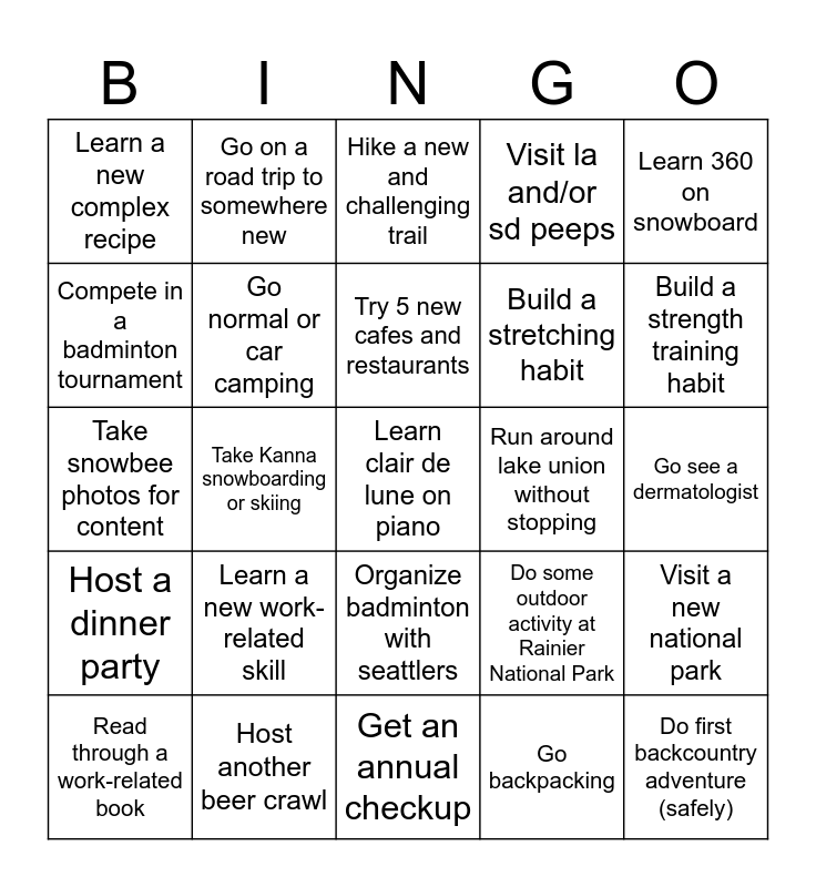 This bingo card has 25 words: Host a dinner party, Host another beer crawl, Learn clair de lune on piano, Go backpacking, Learn 360 on snowboard, Learn a new complex recipe, Go on a road trip to somewhere new, Hike a new and challenging trail, Run around lake union without stopping, Visit a new national park, Compete in a badminton tournament, Go normal or car camping, Get an annual checkup, Do some outdoor activity at Rainier National Park, Build a strength training habit, Read through a work-related book, Take Kanna snowboarding or skiing, Try 5 new cafes and restaurants, Build a stretching habit, Go see a dermatologist, Take snowbee photos for content, Learn a new work-related skill, Organize badminton with seattlers, Visit la and/or sd peeps and Do first backcountry adventure (safely).