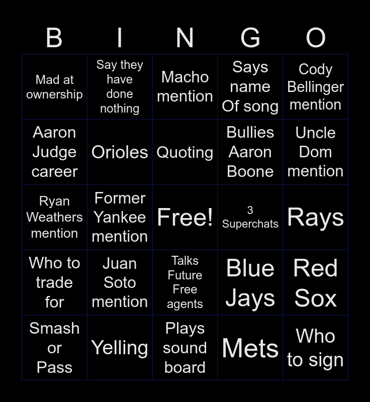 This bingo card has a free space and 24 words: Juan Soto mention, Yelling, Quoting, Smash or Pass, Cody Bellinger mention, Mad at ownership, Aaron Judge career, Say they have done nothing, 3 Superchats, Talks Future Free agents, Bullies Aaron Boone, Ryan Weathers mention, Blue Jays, Red Sox, Orioles, Mets, Rays, Macho mention, Uncle Dom mention, Former Yankee mention, Who to sign, Who to trade for, Says name Of song and Plays sound board.