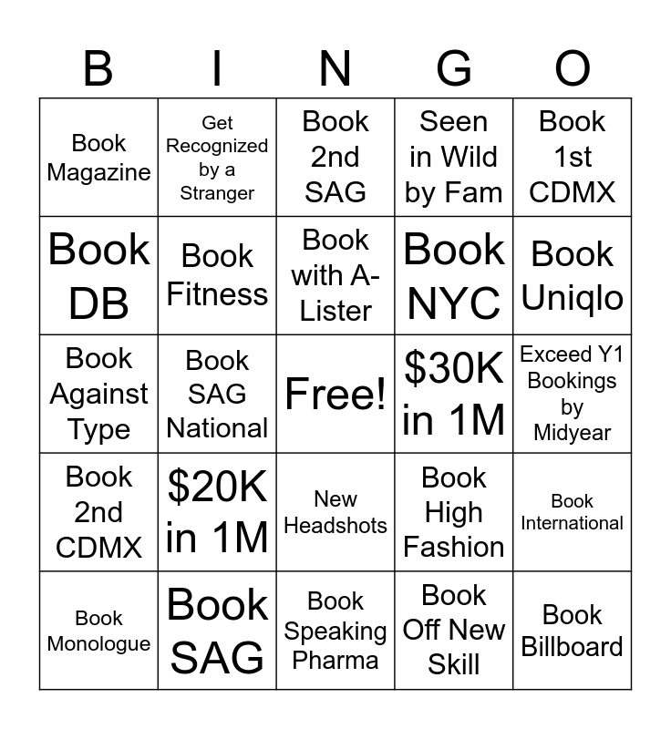 This bingo card has a free space and 24 words: $20K in 1M, Book SAG, Book with A-Lister, Book Monologue, Book 1st CDMX, Book Magazine, Book DB, Get Recognized by a Stranger, $30K in 1M, New Headshots, Book NYC, Book Against Type, Book High Fashion, Book International, Book Fitness, Book Off New Skill, Exceed Y1 Bookings by Midyear, Book 2nd SAG, Book Uniqlo, Book SAG National, Book Billboard, Book 2nd CDMX, Seen in Wild by Fam and Book Speaking Pharma.