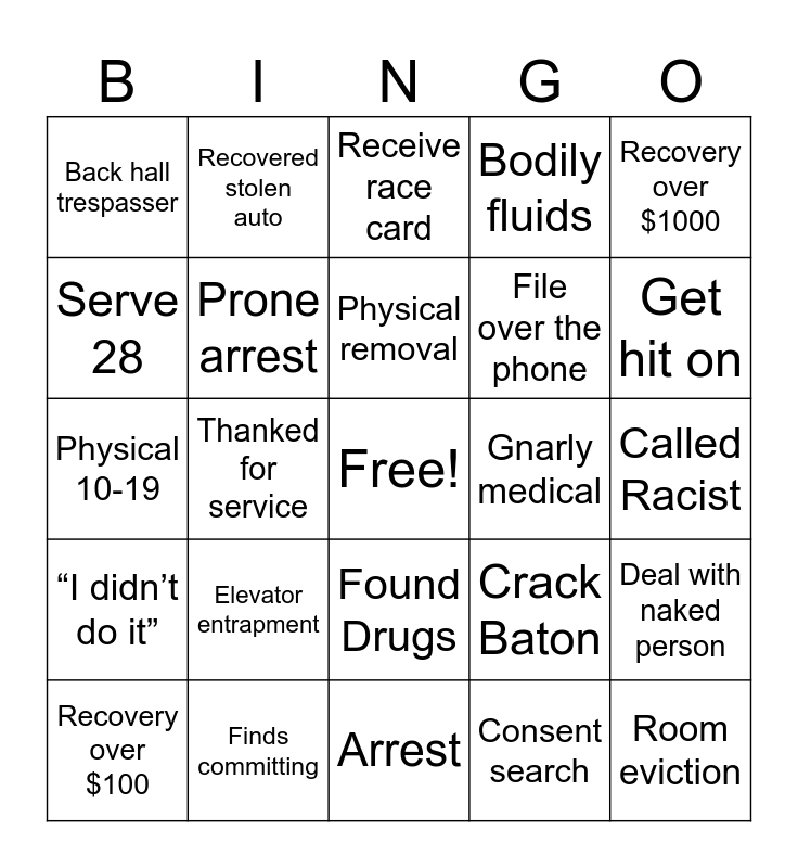 This bingo card has a free space and 25 words: Elevator entrapment, Arrest, Physical removal, Recovery over $100, Recovery over $1000, Back hall trespasser, Serve 28, Recovered stolen auto, Gnarly medical, Found Drugs, File over the phone, Physical 10-19, Crack Baton, Deal with naked person, Prone arrest, Get called “Just Security”, Called Racist, Receive race card, Get hit on, Thanked for service, Room eviction, Finds committing, “I didn’t do it”, Bodily fluids and Consent search.