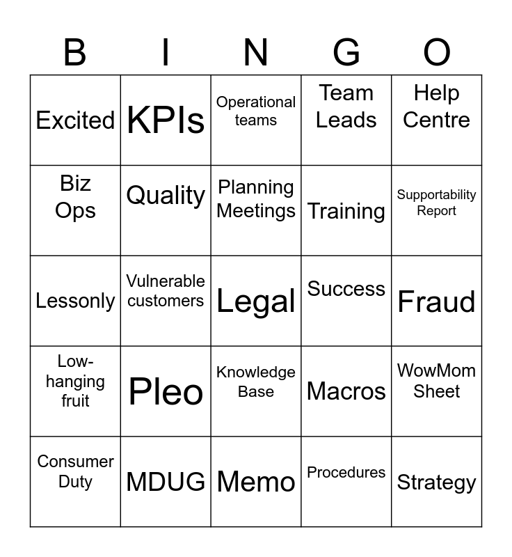 This bingo card has a free space and 29 words: Consumer Duty, As mentioned, Vulnerable customers, Dependency, Excited, Operational teams, Quality, Pleo, Success, MDUG, Fraud, Strategy, Memo, Procedures, Supportability Report, Framework, Knowledge Base, Low-hanging fruit, Help Centre, Lessonly, Macros, Ownership, Training, Biz Ops, Team Leads, KPIs, WowMom Sheet, Planning Meetings and AI.