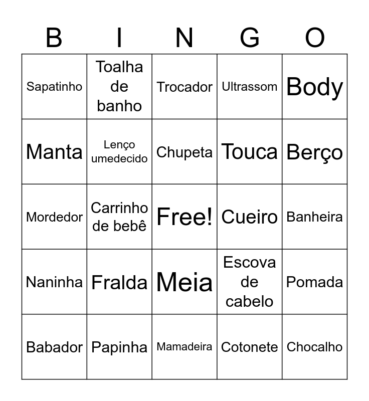 This bingo card has a free space and 25 words: Fralda, Mamadeira, Chupeta, Babador, Body, Sapatinho, Manta, Toalha de banho, Cueiro, Meia, Touca, Mordedor, Escova de cabelo, Pomada, Lenço umedecido, Sabonete líquido, Banheira, Trocador, Berço, Carrinho de bebê, Chocalho, Papinha, Naninha, Ultrassom and Cotonete.