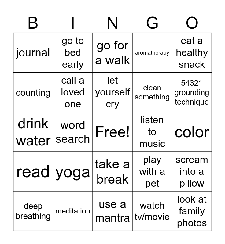 This bingo card has a free space and 29 words: deep breathing, board game, word search, use a fidget, journal, go for a walk, call a loved one, yoga, listen to music, meditation, color, look at family photos, use a mantra, watch tv/movie, 54321 grounding technique, gratitude, take a break, read, eat a healthy snack, drink water, play with a pet, take a warm shower, clean something, counting, aromatherapy, go to bed early, scream into a pillow, let yourself cry and positive affirmations.
