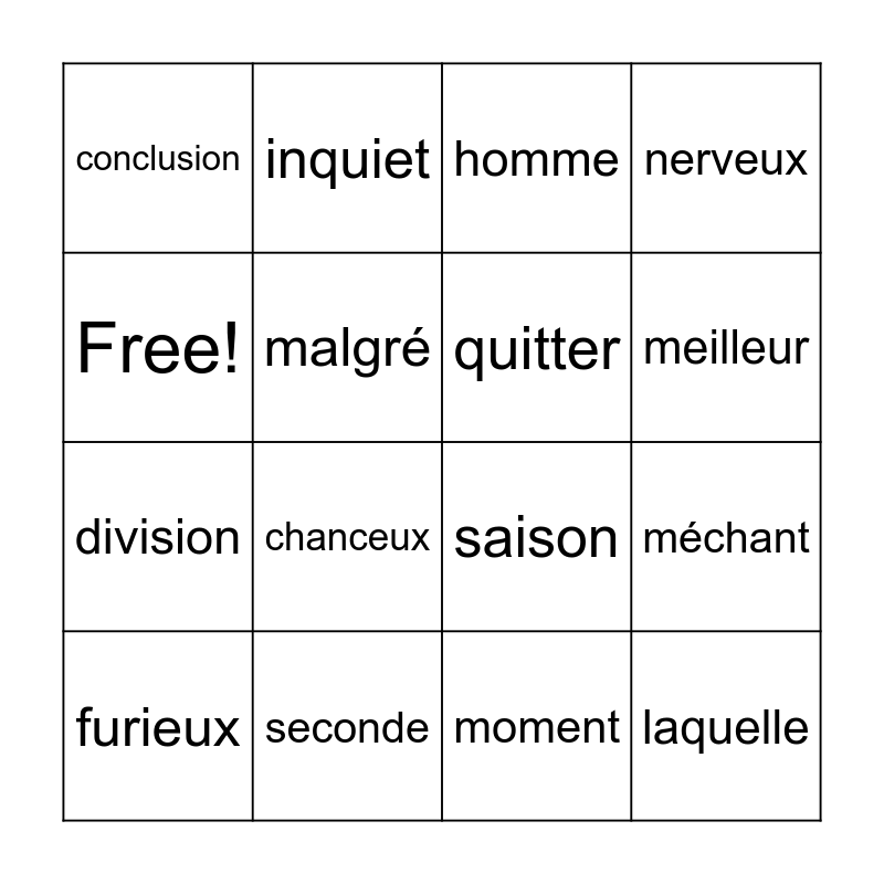 This bingo card has 16 words: seconde, méchant, homme, conclusion, division, inquiet, saison, moment, Free!, malgré, furieux, nerveux, chanceux, meilleur, quitter and laquelle.