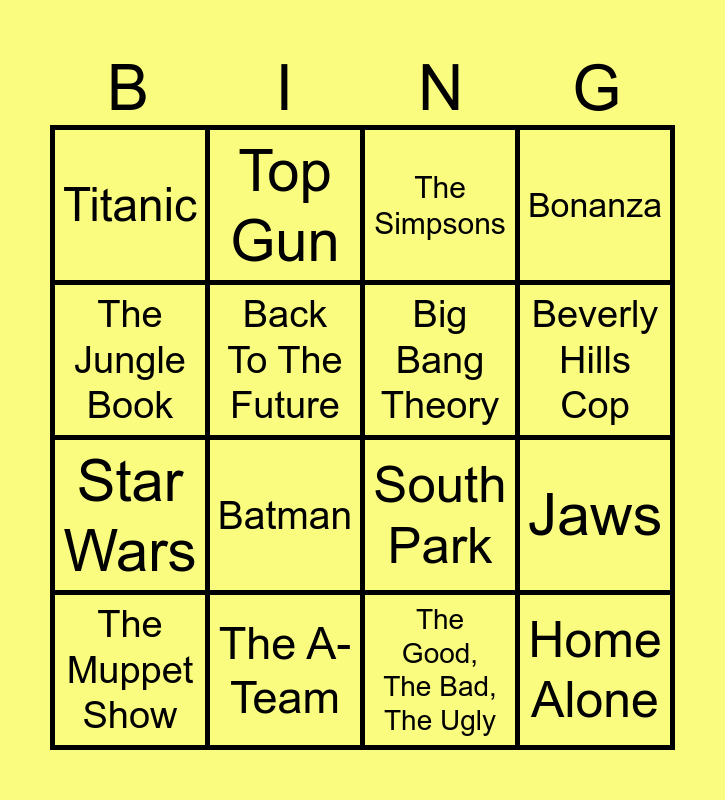 This bingo card has 64 words: Star Trek, Singing in the Rain, The Godfather, Rocky, Dirty Dancing, Frozen, Top Gun, Ghostbusters, Beverly Hills Cop, Amercan Beauty, Pirates of the Caribbian, Indiana Jones, The Good, The Bad, The Ugly, The Jungle Book, Lion King, Back To The Future, Jaws, Titanic, Baywatch, Star Wars, Mission Impossible, Home Alone, Bonanza, Harry Potter, Aladdin, Friends, Toy Story, Men In Black, The Bodyguard, Fc De Kampioenen, Beauty and the Beast, The Pink Panther, Police Academy, James Bond, Batman, Bad Boys, Monty Python, Stranger Things, Game of Thrones, Big Bang Theory, South Park, The A-Team, Knight Rider, That 70's Show, Fresh Prince of Bel-Air, The Muppet Show, Addams Family, Married With Children, MacGyver, The Nanny, Fame, Happy Days, The Benny Hill Show, The Love Boat, Tour of Duty, X Files, The Simpsons, Peaky Blinders, SpongeBob, Shaft, The Flintstones, Pipi Langkous, Dallas and Neighbors.
