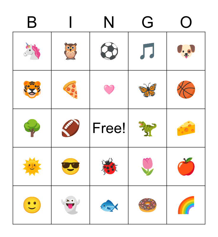 This bingo card has a free space and 24 words: 😎, 👻, 🩷, 🙂, 🐶, 🦄, 🐯, 🦉, 🦖, 🐞, 🦋, 🌳, 🌷, 🍎, 🍕, 🍩, 🧀, ⚽, 🏀, 🏈, 🌈, 🌞, 🎵 and 🐟.