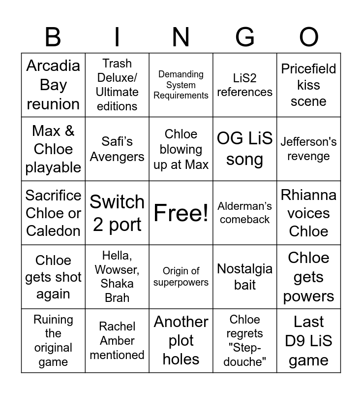 This bingo card has a free space and 24 words: Hella, Wowser, Shaka Brah, Rachel Amber mentioned, Chloe blowing up at Max, Ruining the original game, Pricefield kiss scene, Arcadia Bay reunion, Max & Chloe playable, Trash Deluxe/ Ultimate editions, Alderman’s comeback, Origin of superpowers, OG LiS song, Sacrifice Chloe or Caledon, Nostalgia bait, Chloe gets powers, Safi’s Avengers, Chloe regrets "Step-douche", Rhianna voices Chloe, Demanding System Requirements, Jefferson's revenge, Switch 2 port, Last D9 LiS game, Chloe gets shot again, LiS2 references and Another plot holes.
